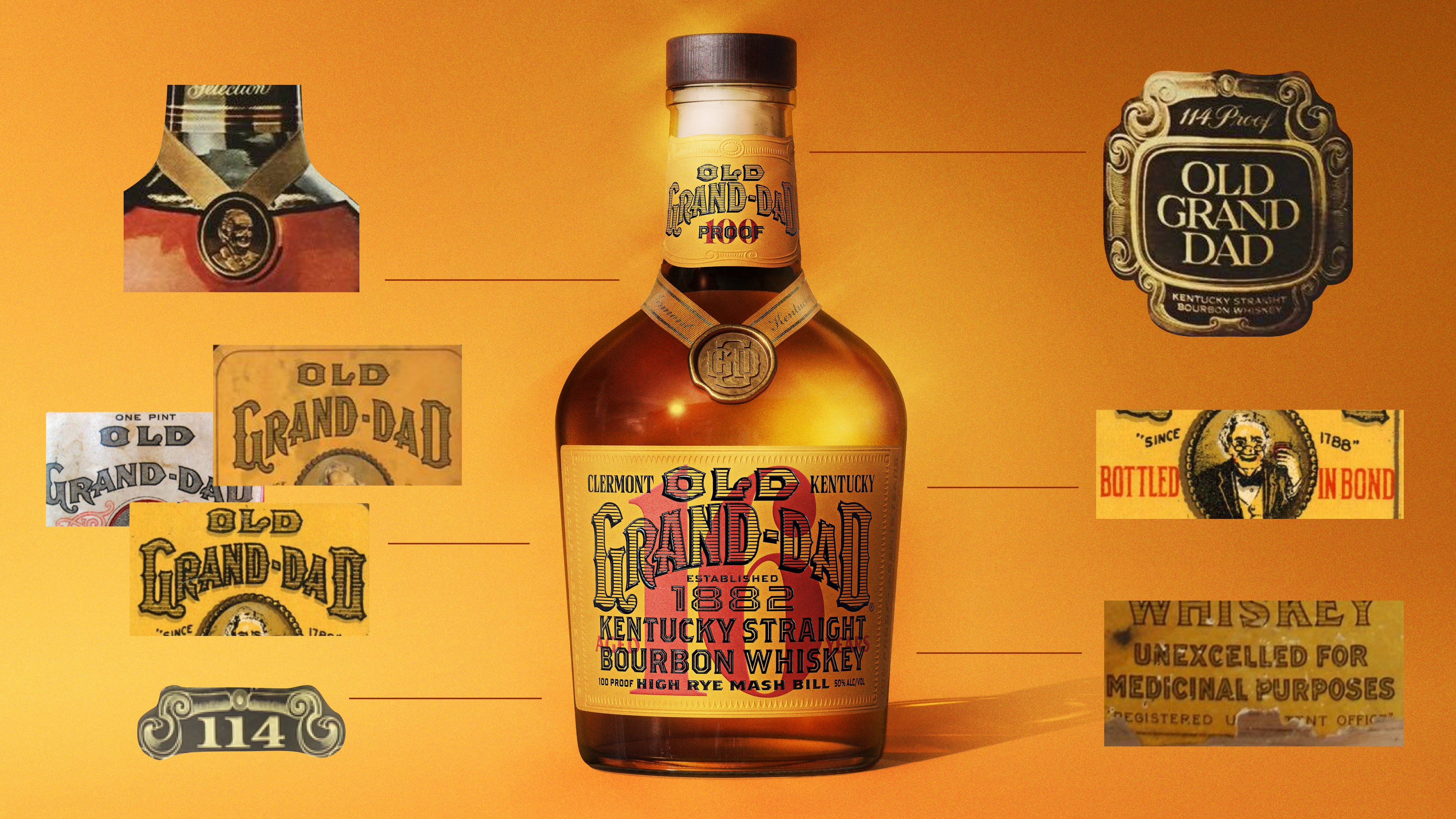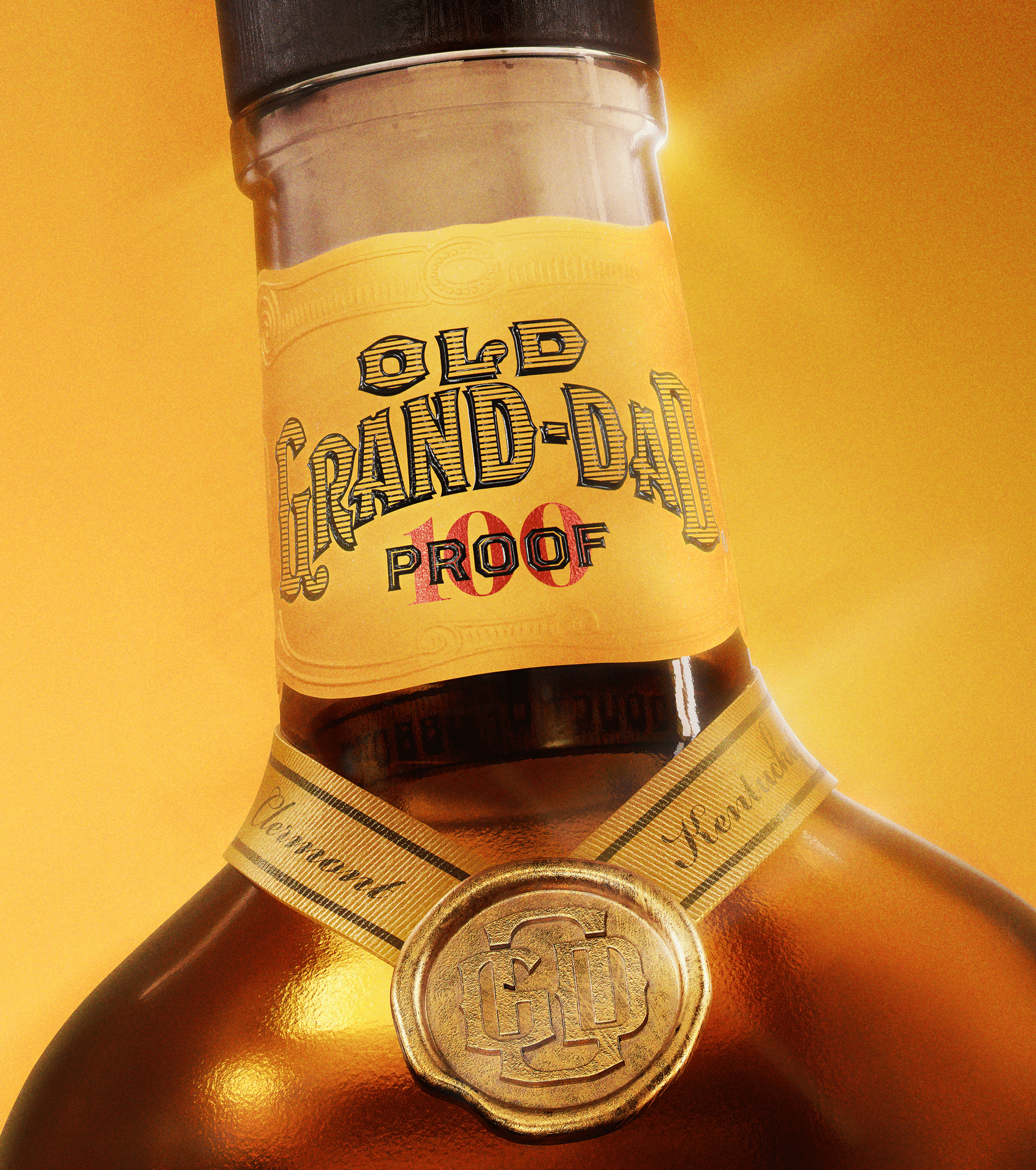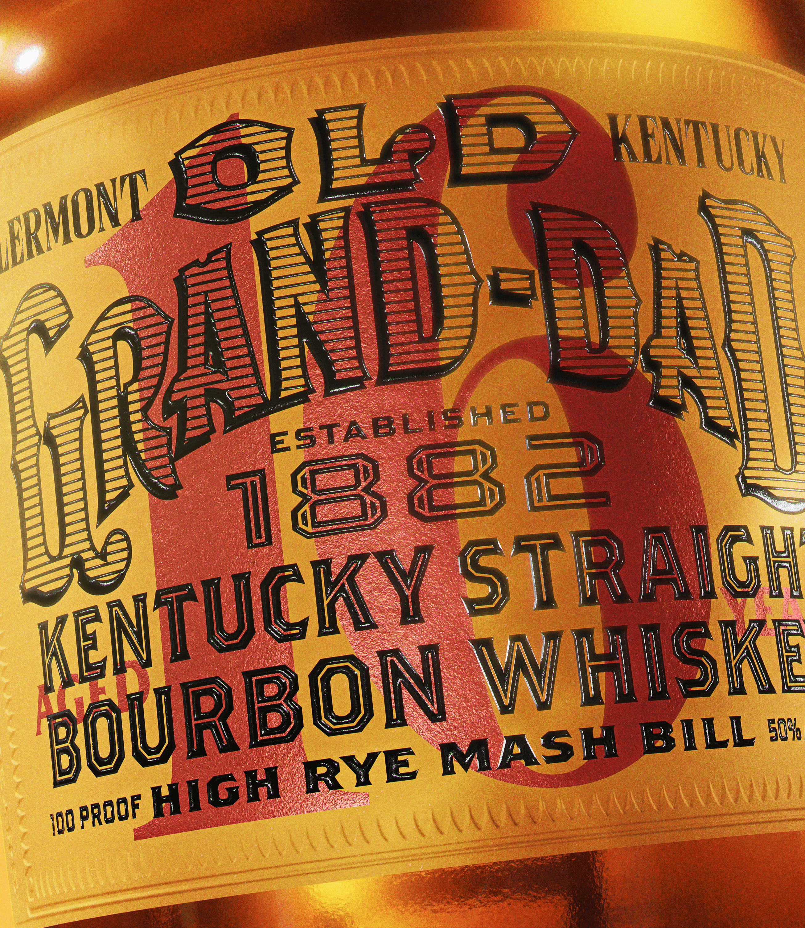 The necker also took inspiration from the brand’s past, drawing from an earlier version of Old Grand-Dad 114’s packaging from the 80’s and 90’s. The ornate cartouche shape around the wordmark echoes this vintage pack as does the golden ribbon around the bottle’s neck. In our version, the wax seal that ties the ribbon together features a contemporary OGD monogram and the ribbon itself includes a second nod to the brand’s provenance. A second red stamped 100 violates “proof” to call attention to the fact that this whiskey was bottled at the classic 100 proof of previous Old Grand-Dad releases. And finally, the bottle structure itself was chosen to mimic this same heritage bottle design.