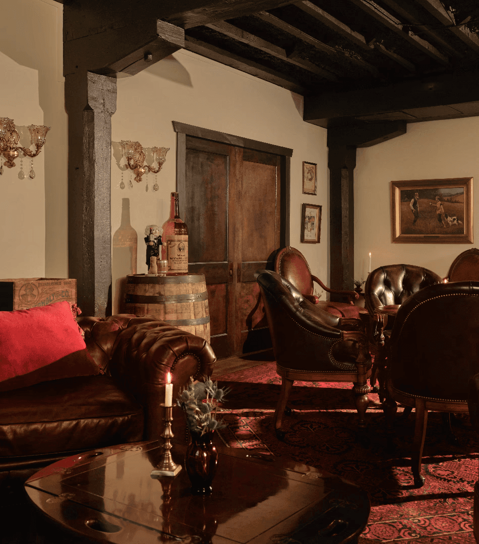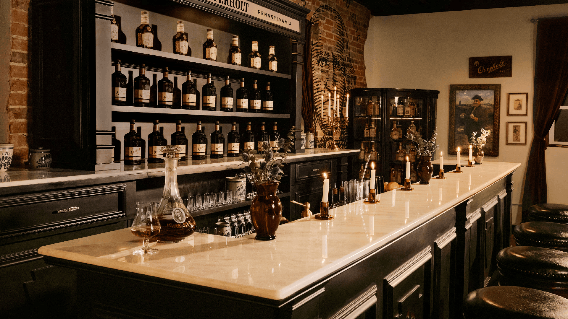 Every inch of the space is meticulously decorated with reminders of the brand’s rich heritage. Vintage Overholt and West Overton ephemera, sourced by TAVERN from antique stores around Pennsylvania, line the walls and lend storied authenticity to the experience. Custom blankets, designed by TAVERN to replicate coverlets made by the Overholt family complement the antique period furniture that brings the space together.